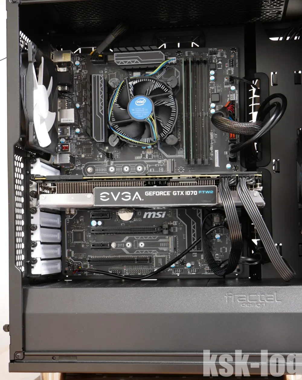 ケースのDefine CにおけるPCIスロットの2,3段目を取り外して設置します。 GPUはそれなりの長さがあるため、MBへの配線も少し考える必要がありそうです。