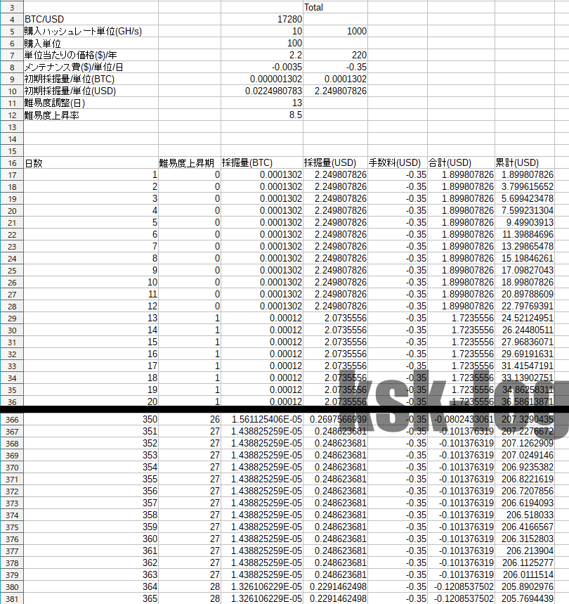 計算では、311日目で採掘BTC量がメンテナンス費を下回ります。 そこまでに$215.759分のBTCが採掘できる見込みですので、計算上は黒字になります。