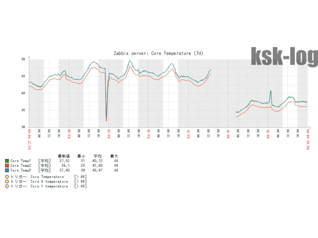増設前はCPU温度は45℃前後だったのが、交換後は37℃前後とかなり下がっています。4/2に温度が一瞬上がっているのはClamAVの定期スキャンによるものでしょう。