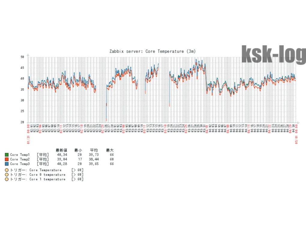 先月自作LinuxPCに増設したCPUクーラーのScythe 虎徹MarkII(SCKTT-2000)、ケースファンのENERMAX T.B.Silence PWM UCTB14Pの効果をZabbixで再度確認します。