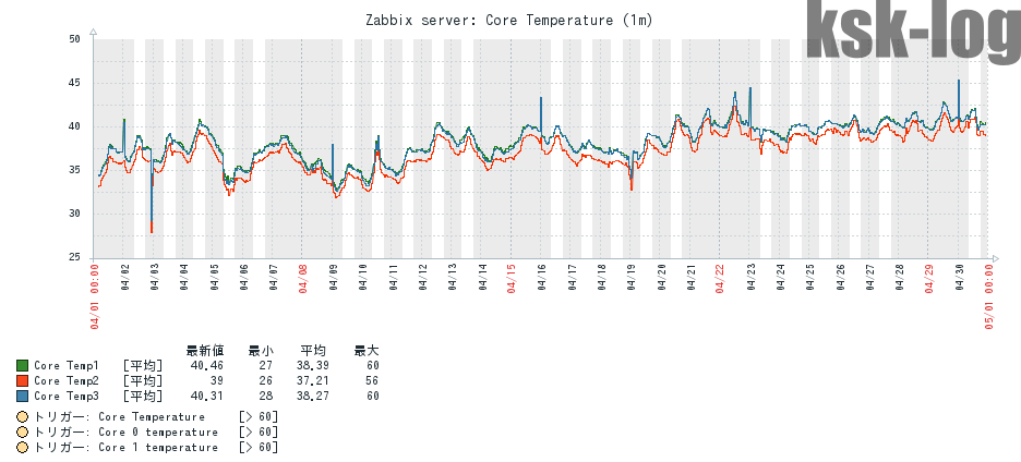 CPU温度はCPUクーラー・ケースファン増設(4/1)で一気に下がってはいますが、気温の上昇もあってか徐々に増加しているように見受けられます。