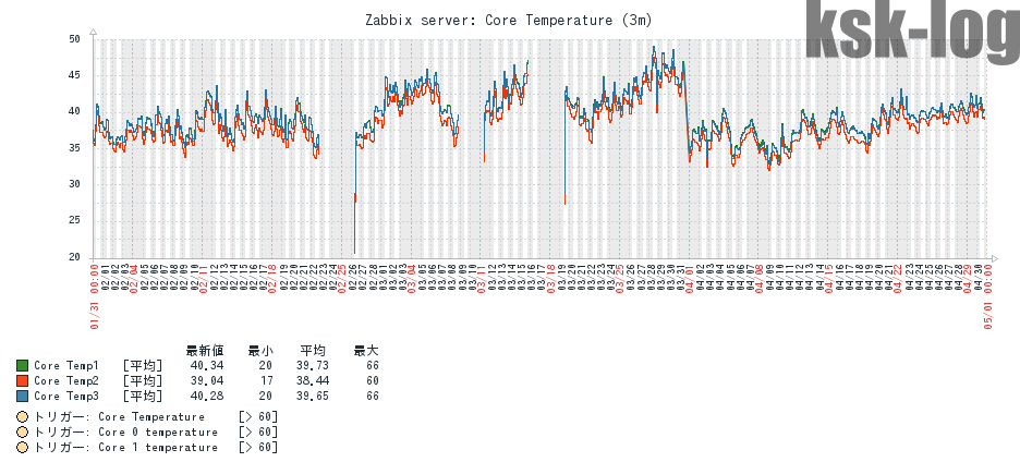 こうして見ると、3月から4月に変わり平均温度が上昇したにも拘らず、CPUの温度に関しては安定して下がっています。