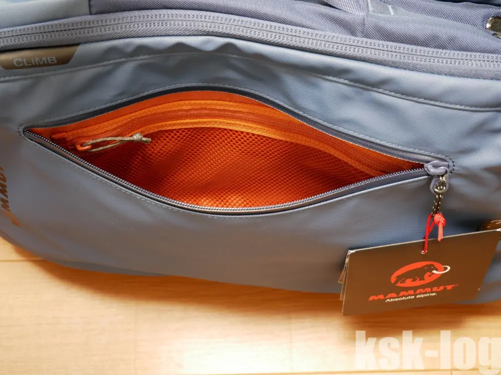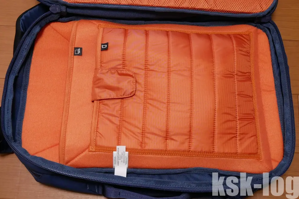 上部のオレンジ色の部分は次に説明する貴重品コンパートメントで、下部のポケットはシューズコンパートメントとなっています。
