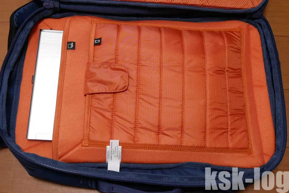 ノートパソコン収納部は厚めで、背中側もフレームがあるのか形をしっかりと保っていますので、パソコンとタブレットの保護はしっかりできそうです。