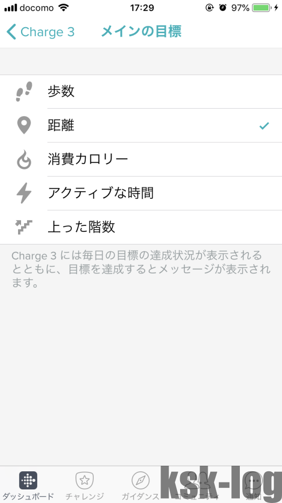 さらに、「アカウント」→「端末名(私ならCharge3)」からメインの目標を距離に設定します。