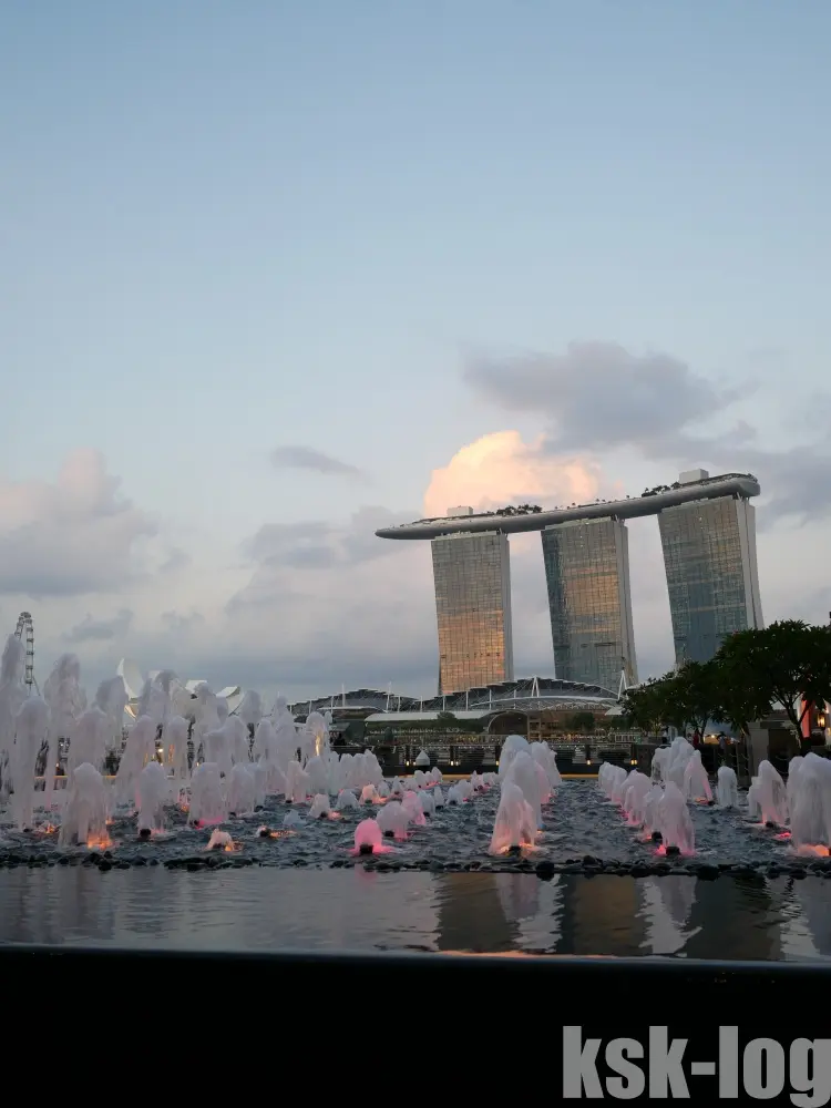 夕日がマリーナベイサンズと港に反射して、なかなか趣深いですね。