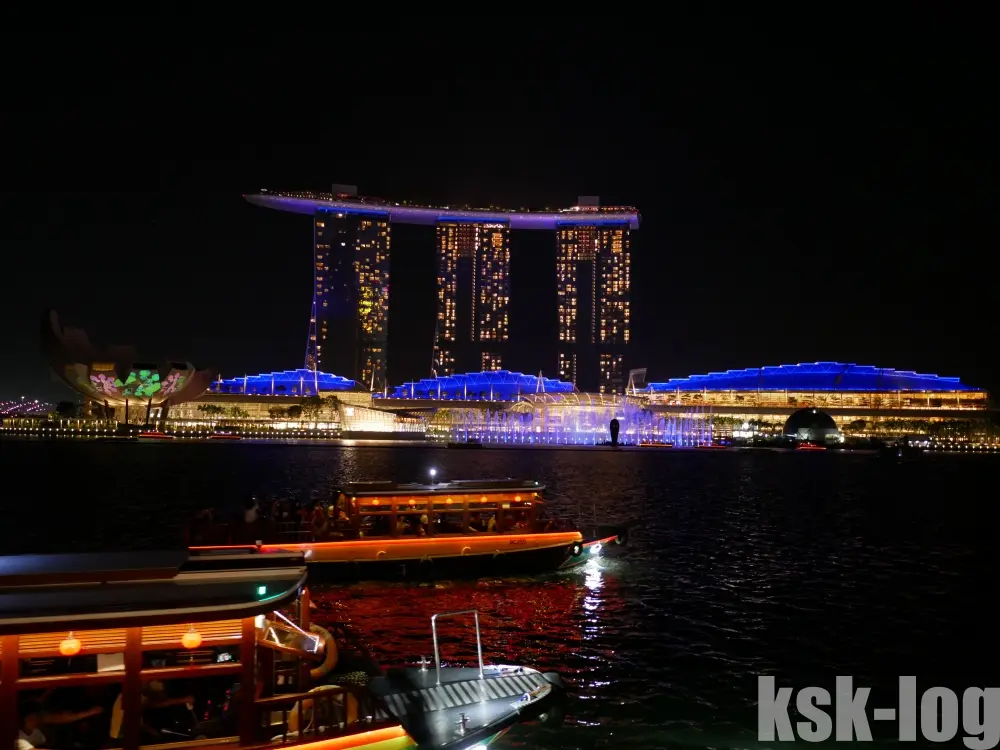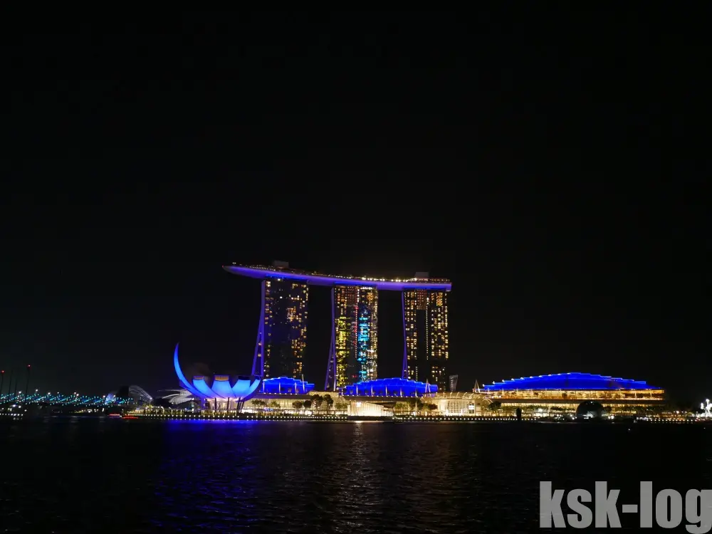 今度はマーライオン公園から夜のライトアップを撮影しました。 マリーナベイサンズ自体は青基調で、シンガポールフライヤーもライトアップされています。