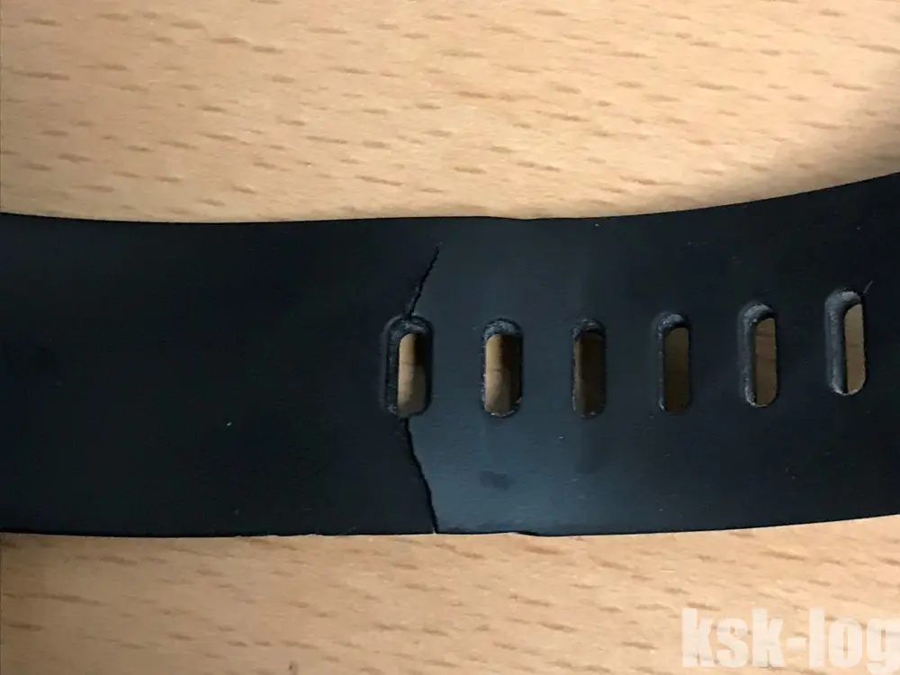まずは普段バックルで止めるのに使用していた穴から亀裂が一気に広がり、、その翌日には金具側のシリコンもちぎれました。