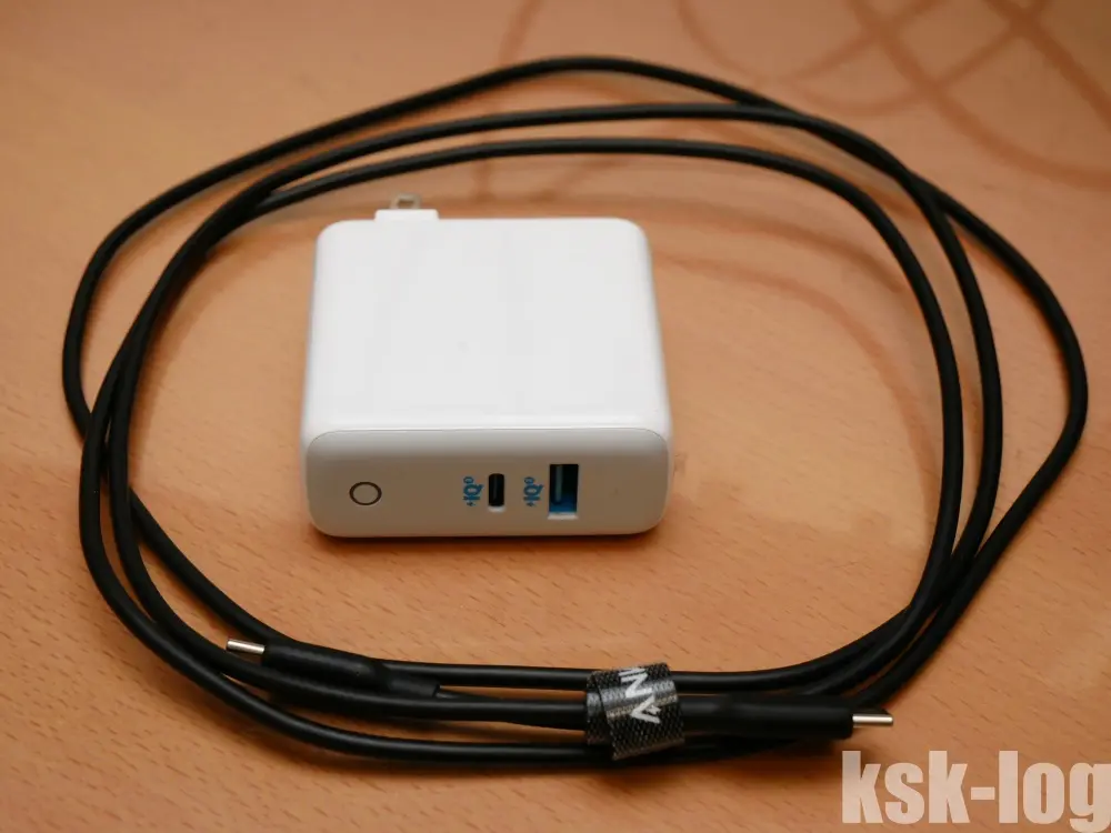 USB-C急速充電器には、PD対応のUSB-CとUSB-Aが端子ずつあるAnker PowerPort AtomIII (TwoPort)を以前より利用していたのでそのまま利用します。なお、USB-CはPD対応かつ45Wまで出力可能で、商品説明にある60Wは合計なので注意が必要です。