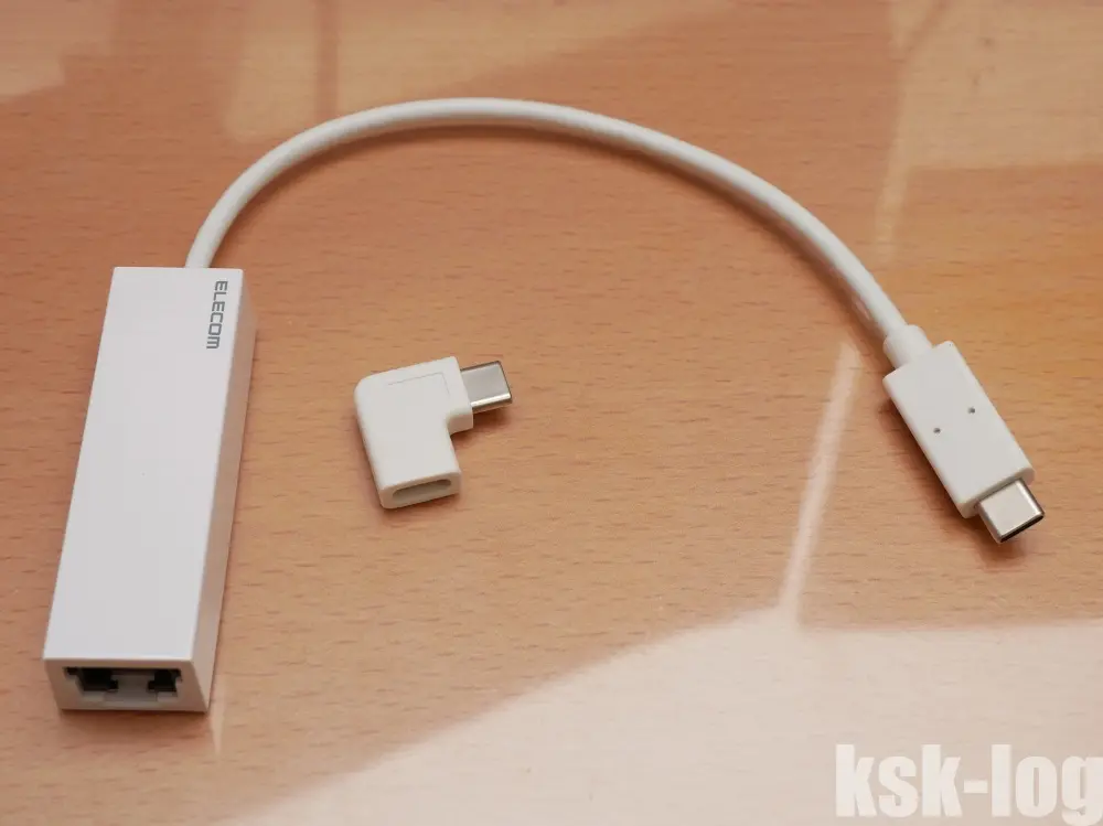 USB-CとLAN(RJ45)端子の変換ケーブルはELECOMのEDC-GUC3L-Wを選択しました。L字端子のないEDC-GUC3もありましたが、なぜかL字端子(取り外し可能)の方が安かったのでこちらに。