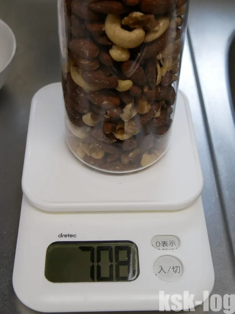 手持ちのキッチンスケールで計測すると、クリアボトル1.0Lの重さは150gで、満杯までミックスナッツを入れると708gとなりました。
