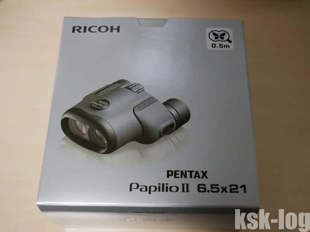 外箱の外観です。マクロ双眼鏡のPapilioということで、蝶と虫眼鏡のロゴに0.5mが強調されてますね。