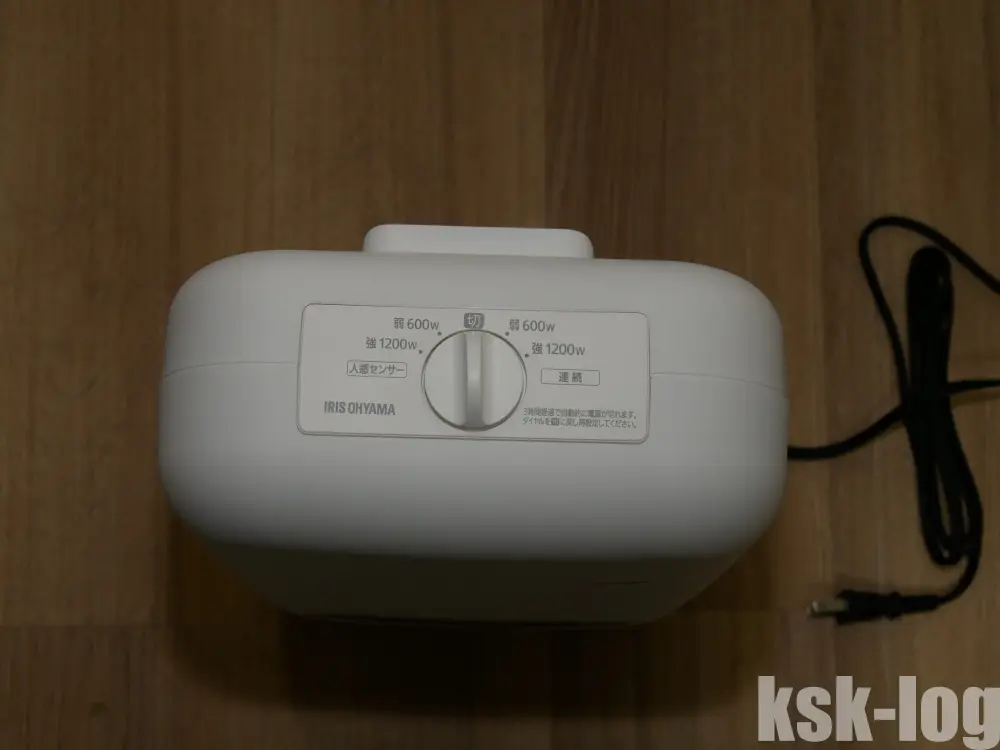 本体上部に動作用ダイヤルがあります。人感センサーを有効にした600/1200Wと、連続稼働の600/1200Wで切り替えることが出来ます。