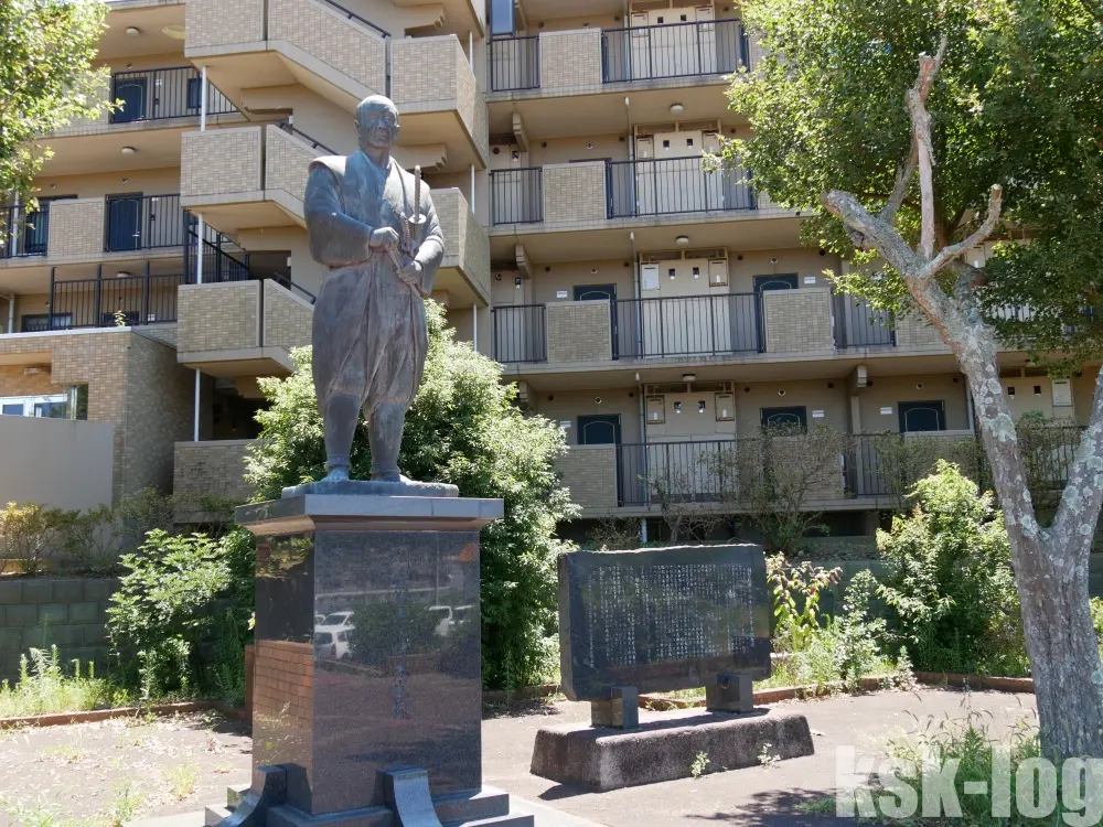 昼食を鹿島神宮前のそば屋で済ませ、鹿島神宮駅まで歩いていきました。その途中に塚原卜伝像が設置されています。こちらは先述の天真正伝香取神道流などを学び、鹿島新當流を起こした剣聖の1人ですね。鹿島神宮周辺にはこのほか、鹿島アントラーズ関連の像なども置かれているので、ついでにこの2か所を回ってみるとよさそうです。