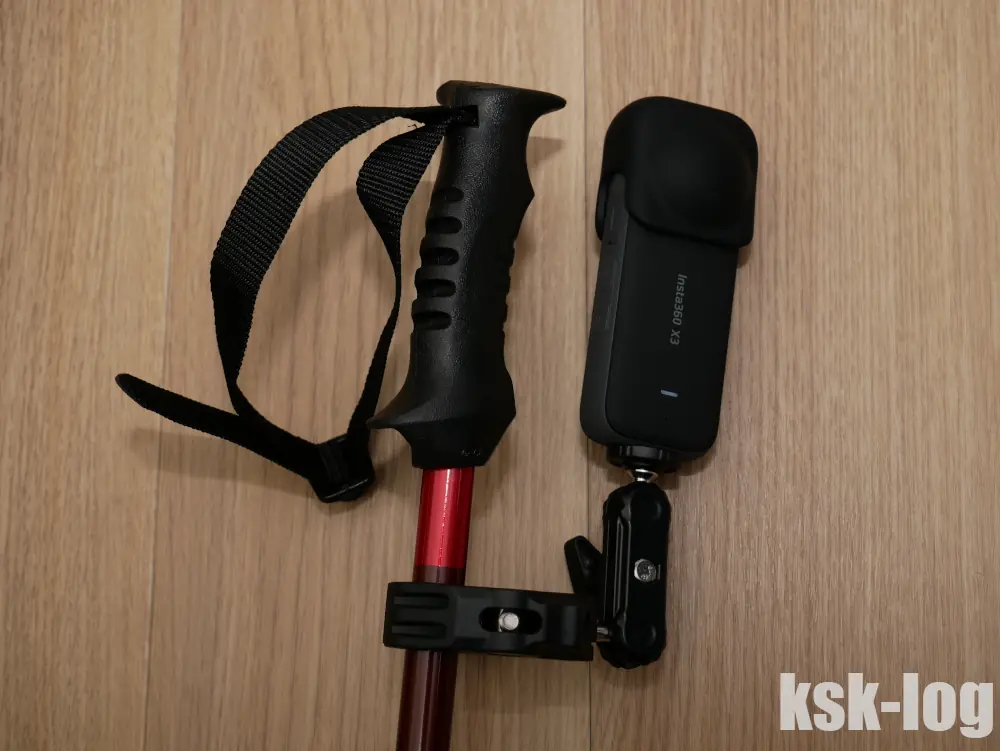 また、単にストックの上部に自撮り棒を延ばすだけではなくて、クランプの雲台を調整してストックとInsta360X3の角度を開いて横に自撮り棒を延ばすことも可能でしょう。この辺りは取りたい動画に応じていろいろ調整していく必要がありそうです。