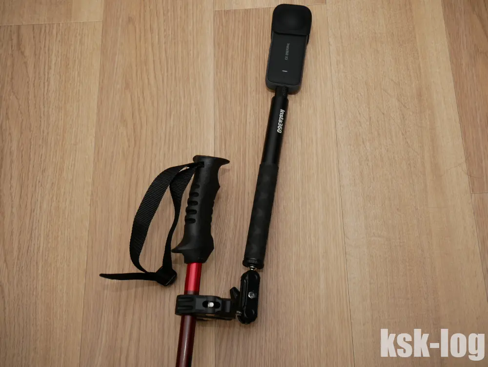 自撮り棒を使わずストックに取り付けてみるとこんな感じです。この場合は360度撮影というよりは正面撮影ように使うことになるでしょうか。