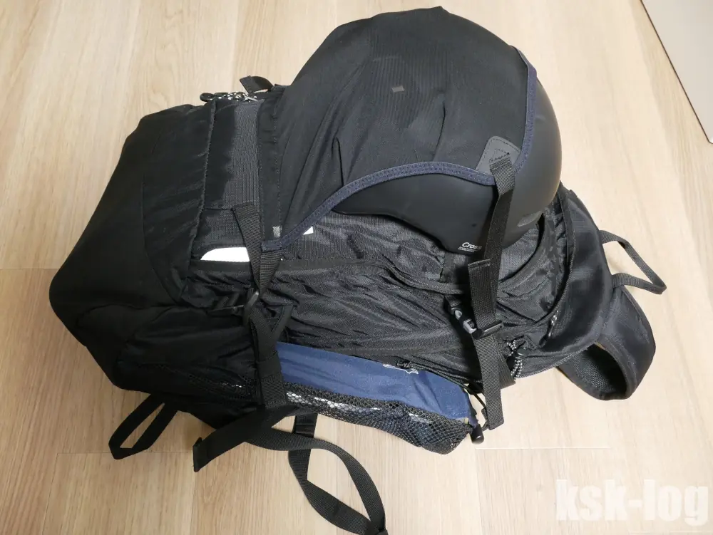 インラインスケートの用具は嵩張りますが、このうちヘルメットをリュックの外側にヘルメットホルダーで取り付ければブーツをリュックに入れる余裕ができるのではないかと考えました。