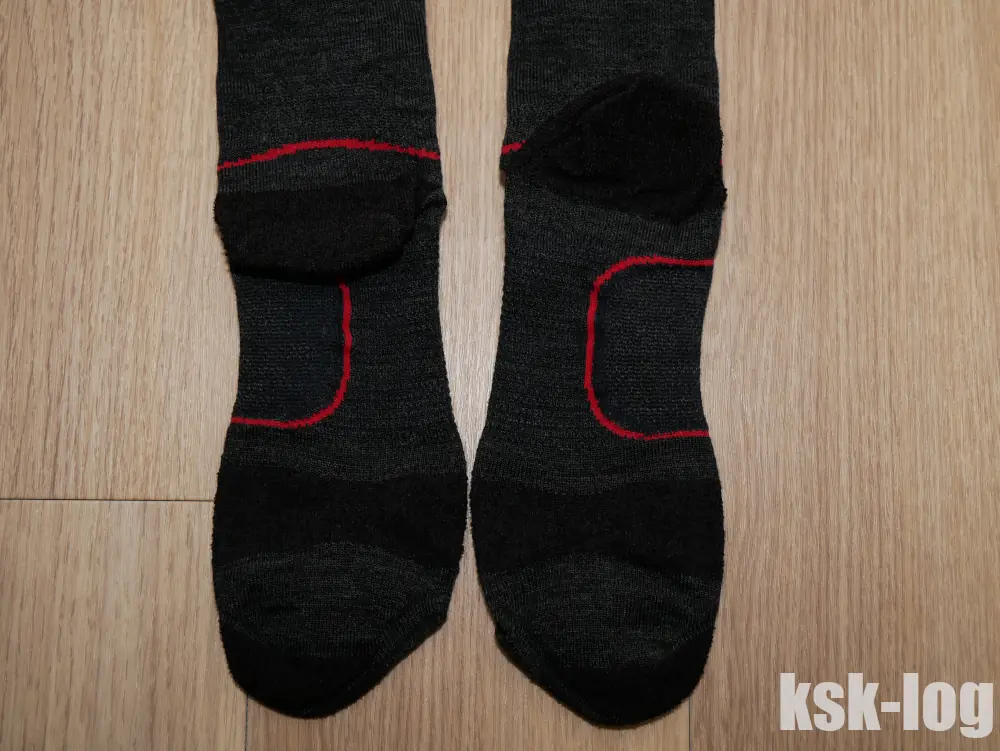 実際にこの厚みの差でジャストサイズで選んだスキーブーツの脱ぎ履きのしやすさも結構違いましたし、さらにはモンベルのソックスはサポーテックの仕様もあって圧迫感も強めでした。なので着用感はMicoの方がかなり快適でしたね。