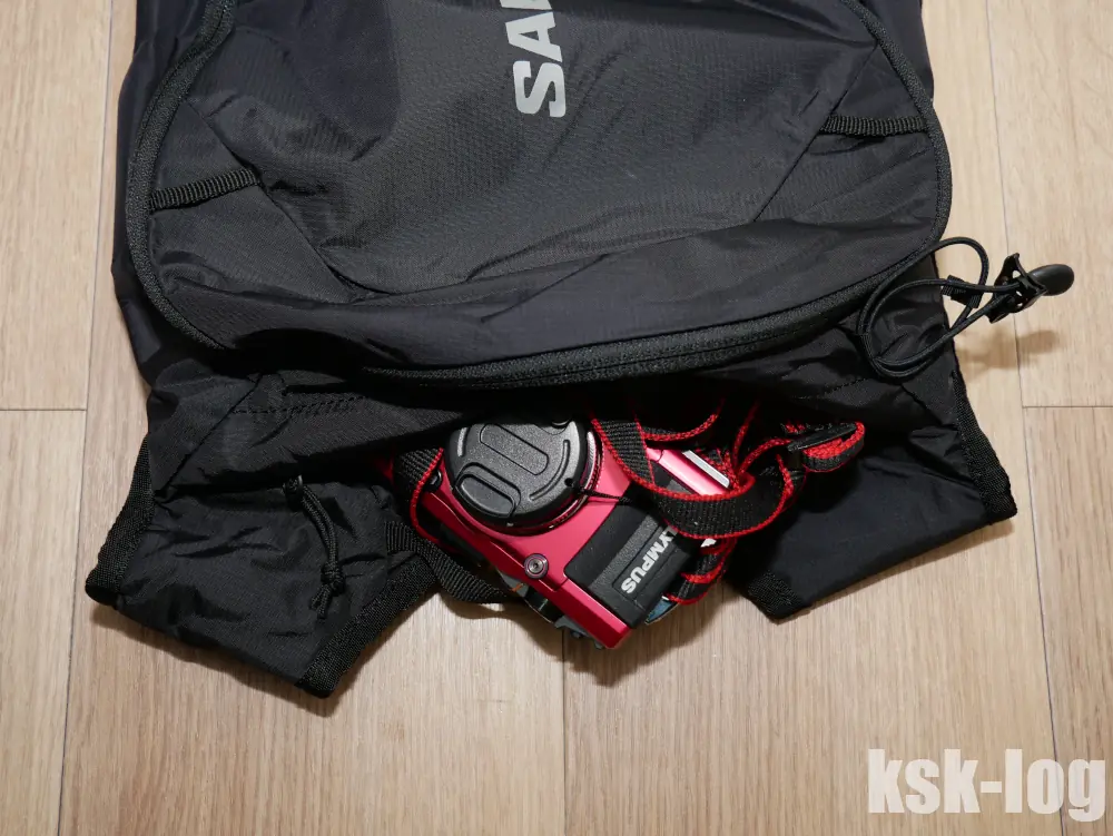 本体上部のポケットにコンパクトデジカメであるTG-4を入れ、メイン収納にInsta360x3や自撮り棒、チェストマウント、ペットボトル飲料などを入れて利用しました。これでも容量的にはかなり余裕があるので、あとは軽食など必要に応じて追加することもできそうです。
