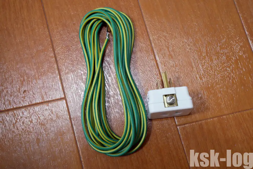 そのため、5mのアース線を購入して延長することにしました。私が購入したのはSANWA SUPPLY アースケーブル KB-DE5 [5.0m /スイッチ無]↗です。