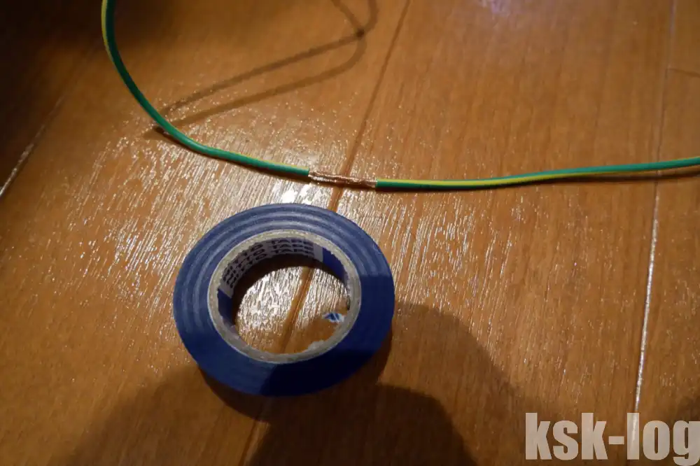 これの被覆線を剥いて標準のアース線とより合わせてビニールテープで上から巻きます。