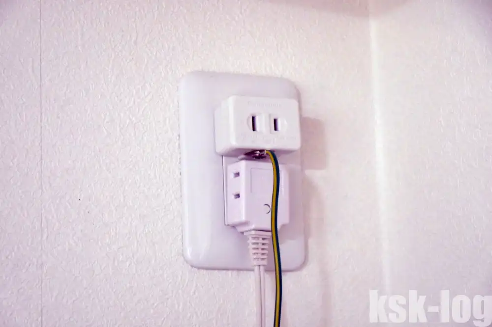 さらにPanasonicのアースターミナル付き変換アダプタWH2881P↗にアース線を取り付けて、3本コンセントに差し込んでアース確保完了です。