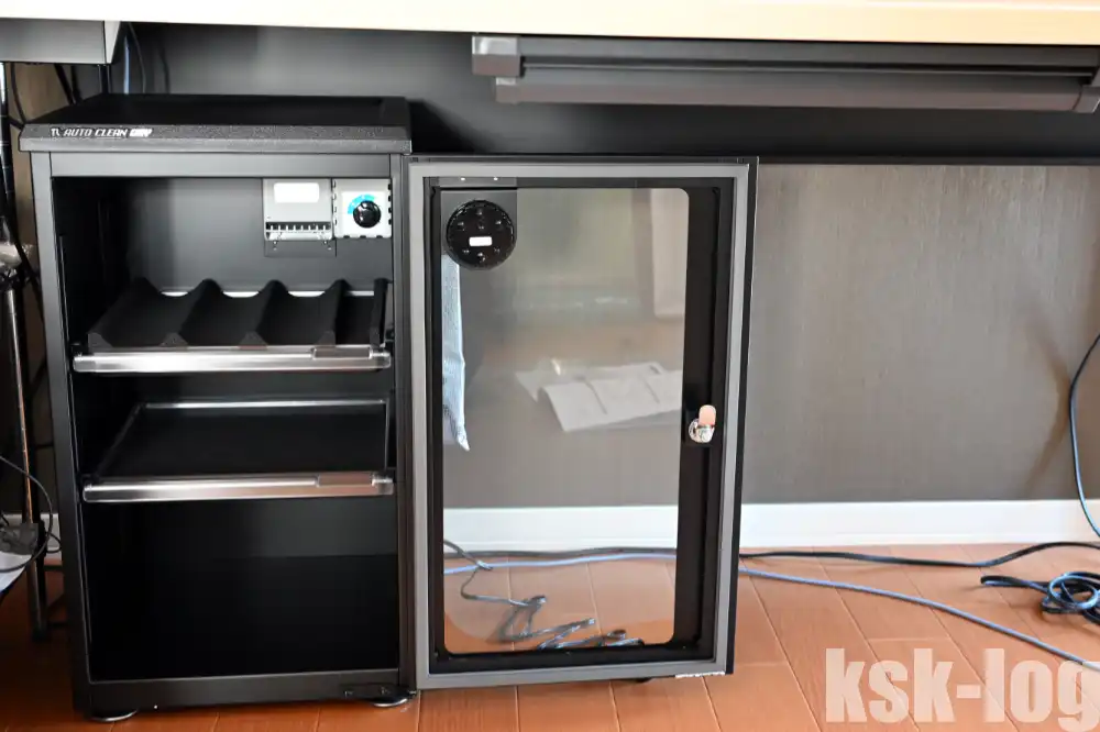 乾燥剤式の防湿庫で定評のある、東洋リビング ED-55CAT2を購入してデスク下に設置しました。安くはない買い物でしたが、乾燥剤交換の手間がなくなってかなり楽になりました。